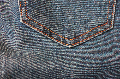 Denim Jeans Fabric Texture Detail Dark Vintage Blue Jeans Back Pocket Element Seam Pattern Close Up Top View Casual Retro Style Trousers Denim Pants Structure Background Back Wall Mural Ba Onajourney